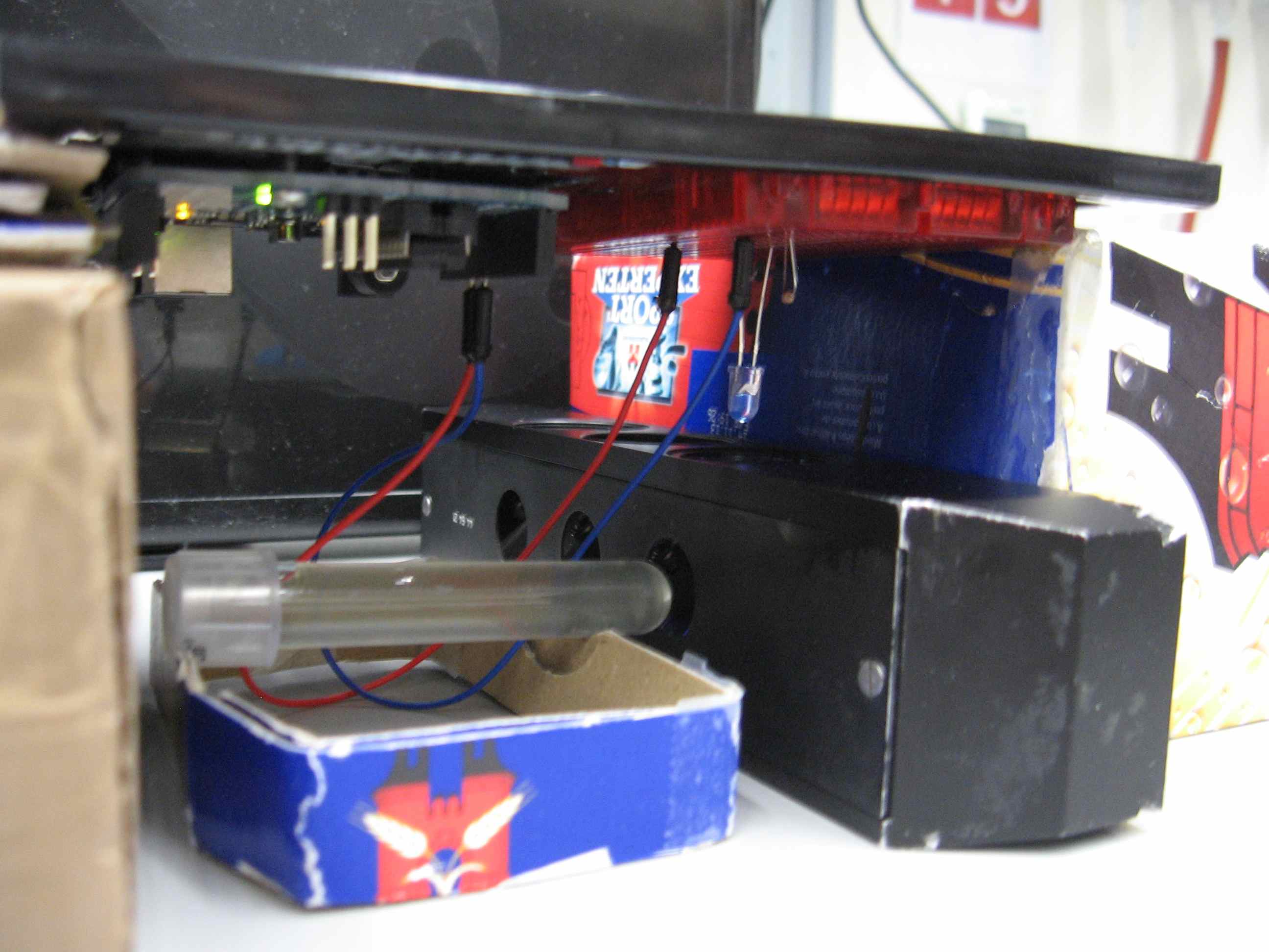 So the tools are a computer to write the script for the microcontroller and supply the two hirshman plates which connect the excitation LED and the photoresistance with the measurement components, the filters in the filter holder, some structural elements and the Feldshlossen (red and blue) box to isolate the photoresistance from the LED’s lightening. After assembling it looked like this: