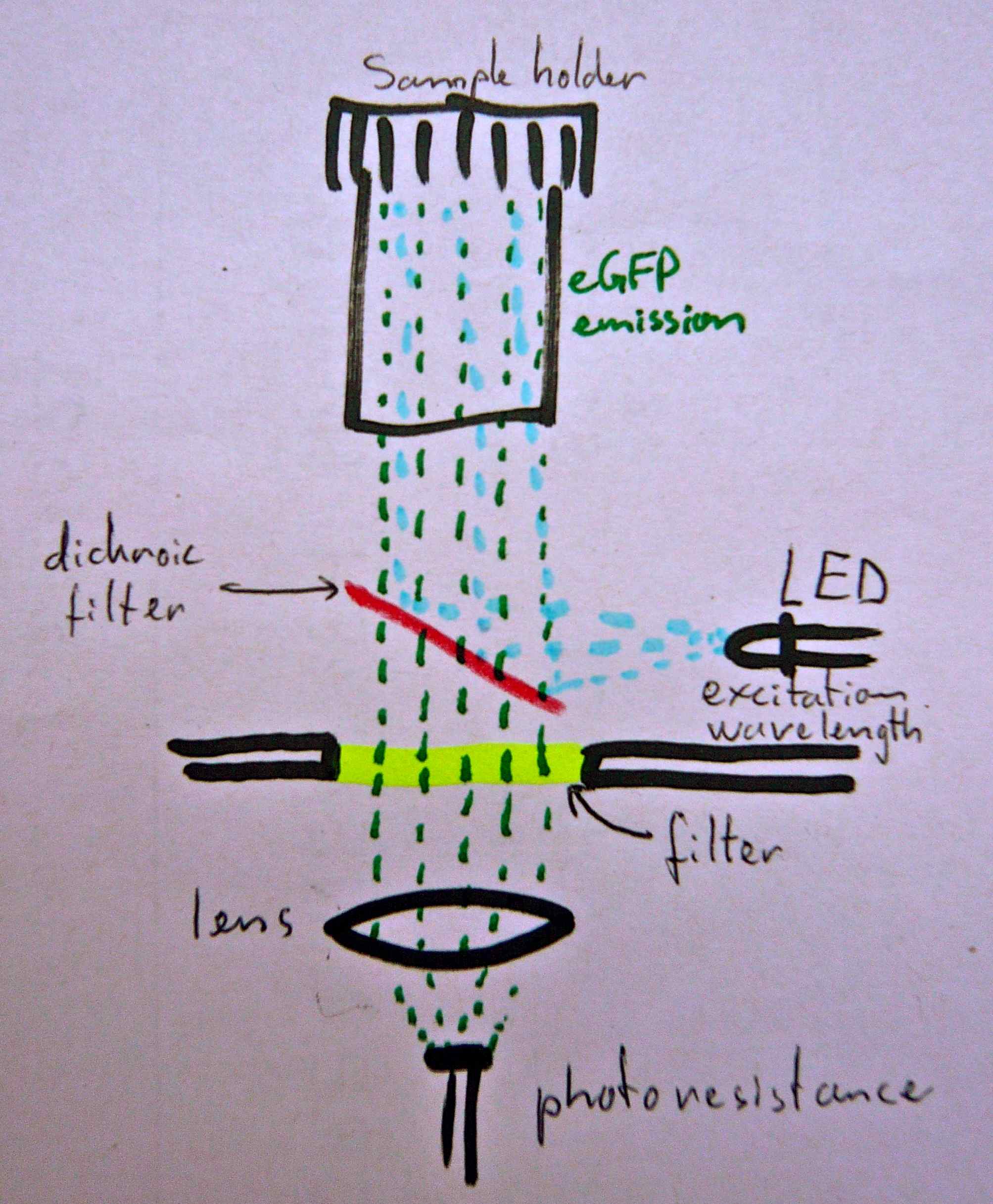 The measurement device was able to discern between ambient light, which generally gives values between 70 and 110, very intense light which gives values about 400-600 (maximum was 1023), and absence of light was quantified at 0 or 1. So we tried to do some tests with bacteria which express constitutively eGFP (thanks to a plasmid), and with Dextran, a polysaccharide which reacts like GFP, but no light was detected by the photoresistance. So we tried to do the measurement without the filters to avoid the filter transmission factor which decrease the light intensity and we discover that the light from the LED was not detected when the LED was just put behind the filter holder. Another thing we tought about was the fact that the sample holder bottom was not really made for letting light pass through because of it’s curvature which refracts the light. So we tried to measure from the sample holder’s sides and we concentrate the light emission with a lens: