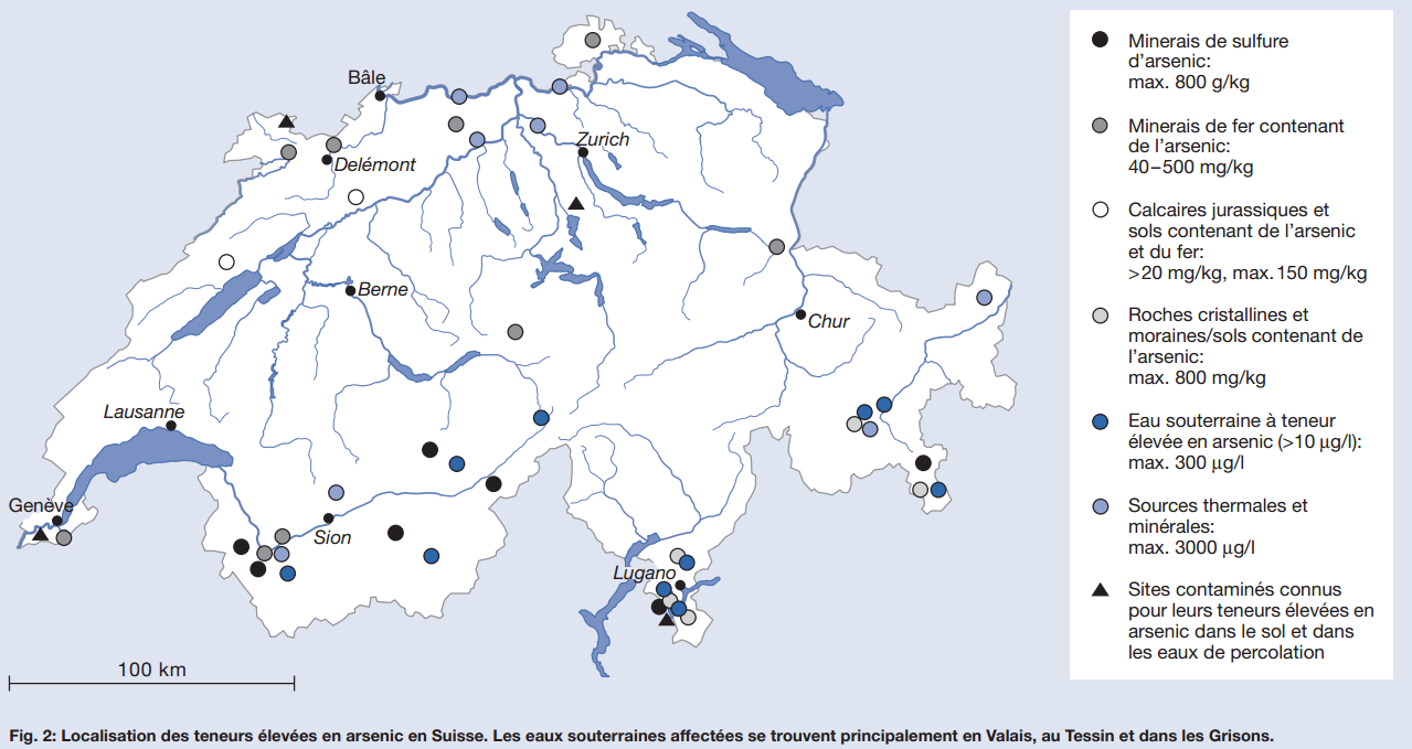 In Switzerland, there are some geological contamination with arsenic, particularly in the massif of the Mont-Blanc, above Martigny. We also find some arsenic contamination in the Tessin where gold was formerly mined.