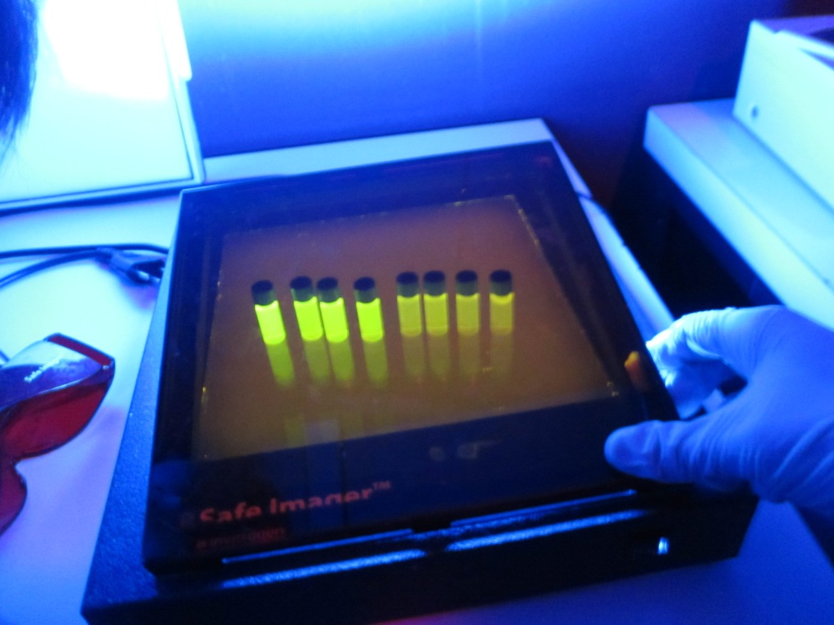 Device for fluorescence detection, a plastic filter only let the wavelength we need