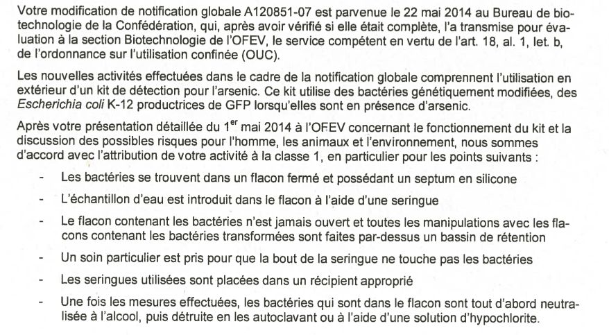 Here in Switzerland, we had some great news over the summer. All of the work of Bastien and Falco from the spring semester, with the support of Dr. Leuenberger of the Biosafety Office of EPFL paid off – and we have our notification A120851-07 Recherche en sciences de la vie approved by the Swiss Federal Office of Environment.