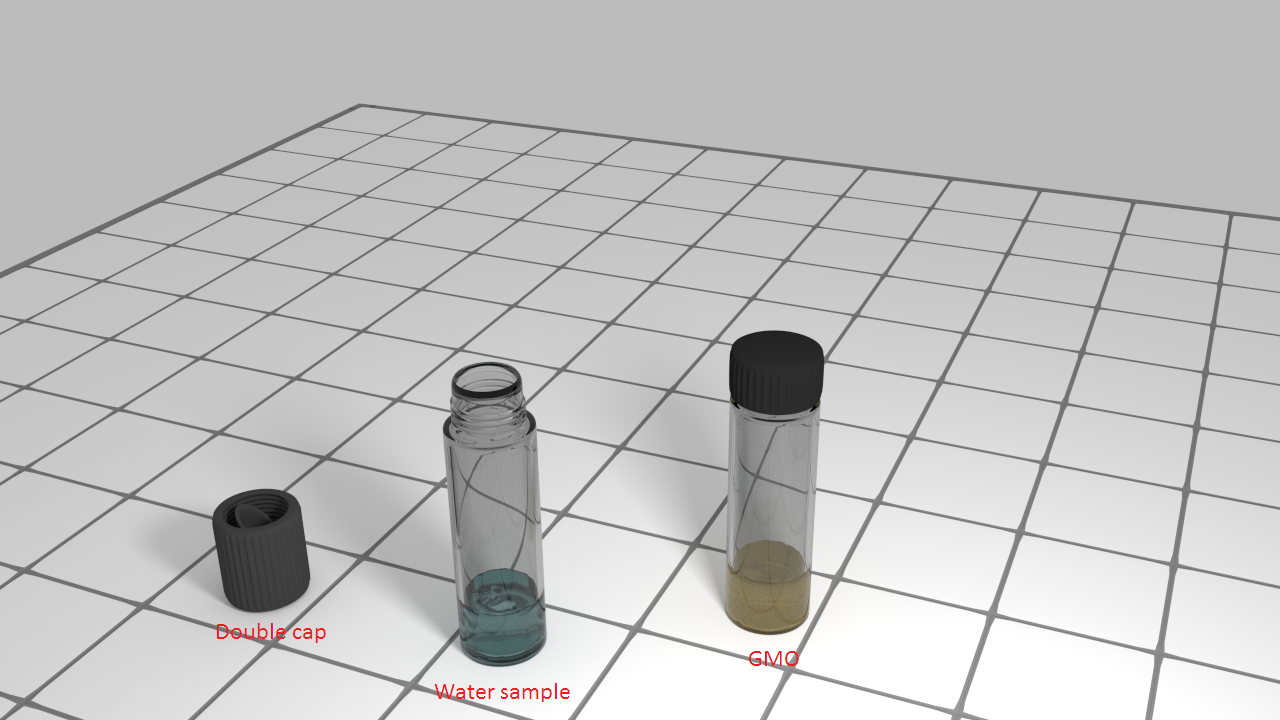 One of the aim of the spring team at EPFL was to design a new cap for secure sample collection. We need to keep the GMO reporter bacteria from being released into the environment. Originally, with the Swiss Environmental Agency, we are approved to use a vial with a hermetic cap, where the water sample will be introduced by a syringe. The idea was to replace the syringe by a double cap, hermetic to prevent the bacteria from leaving the vial. Also, syringes are extra waste that can be dangerous if accidentally left in the field. It can prick and be the cause of transmitting diseases.