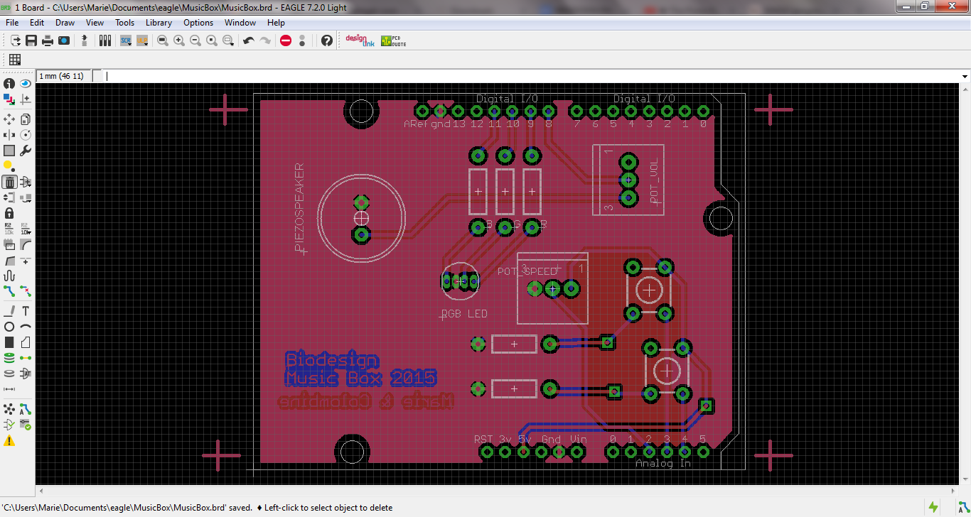 We then designed our printed circuit board using the EAGLE (Easily Applicable Graphical Layout Editor) software, which has a freeware version available. To learn how to use this software, we found a tutorial on Sparkfun. We added two different libraries on EAGLE in order to find our specific components. Both libraries are on github, the first one is Adafruit, and the second one is Sparkfun.