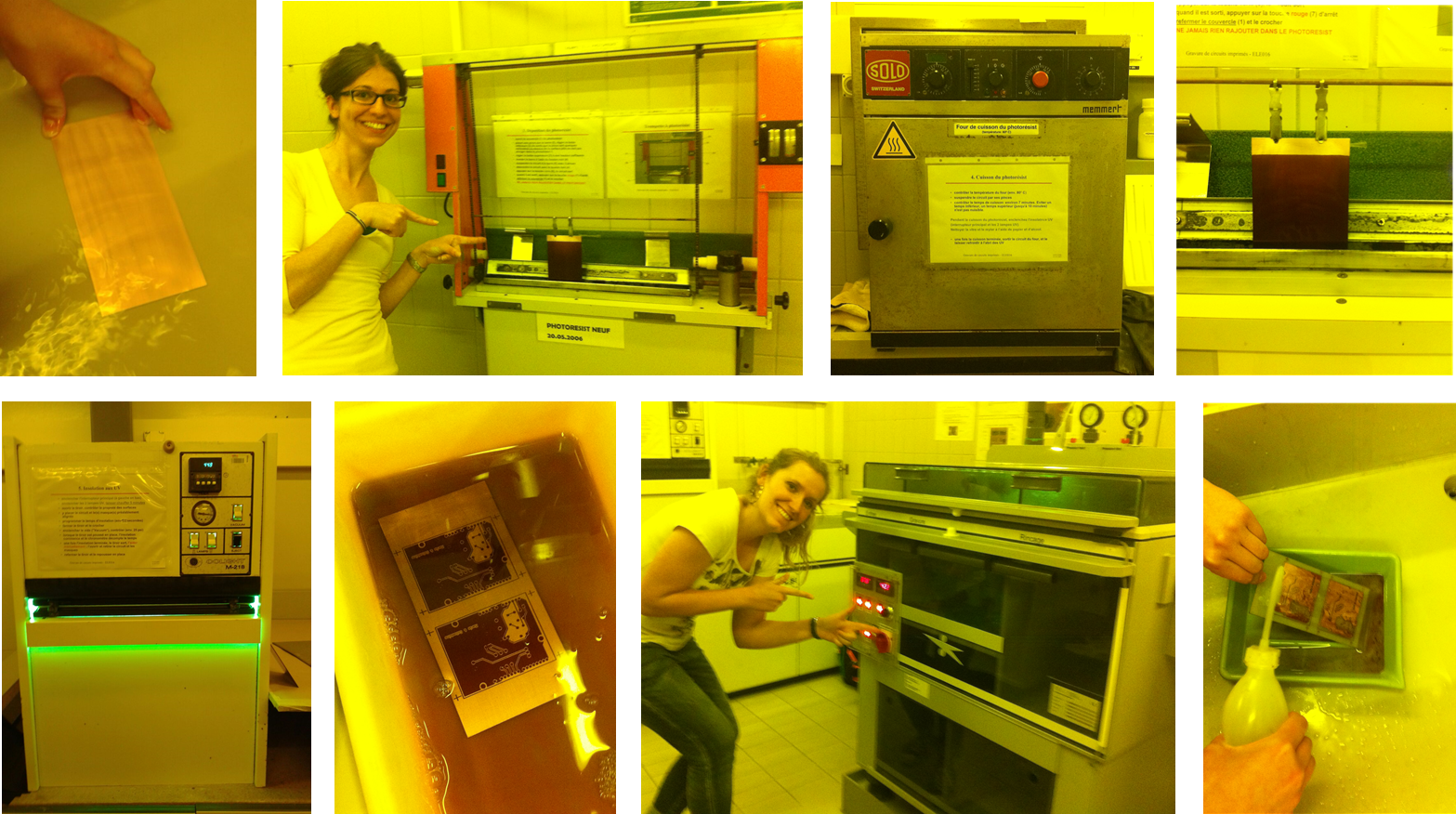Then, we went to the laboratory and followed a specific procedure to create the printed circuit including several washing steps of the copper plate, photoresist covering of the plate, printing of our circuit onto the plate with UV light, acid engraving …