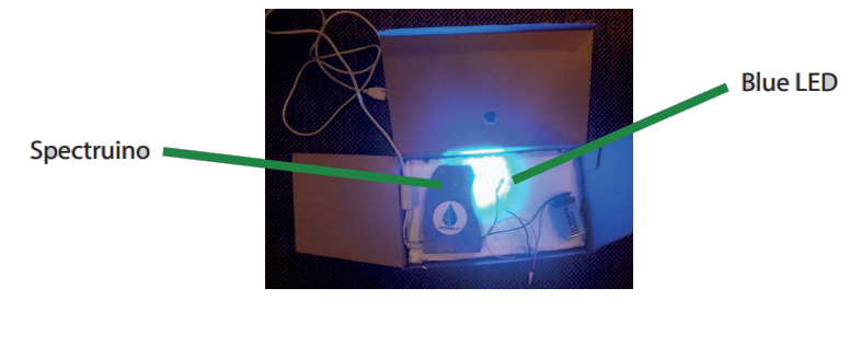 The blue LED goes through the vial and spectruino detects the resulting spectrum. The spectruino is connected to a computer which displays the spectrum.